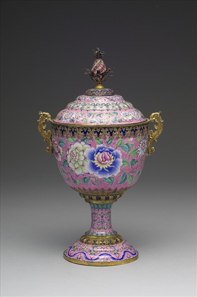 銅胎畫琺瑯。侈口,碩腹,三階式高足,夔龍雙耳,帶四階式鳳梨形鈕蓋。器與蓋鏨裝飾花葉紋多道,雕刻細膩,內填燒松石藍與寶石藍色釉,其餘施粉紅色釉為地,繪飾西洋式裝飾花卉。足底露胎,中陰刻「乾隆年製」楷款,下有紫檀木座,與故琺37一式成對。本器應是廣州民間作坊仿西洋高足杯的形制製成。