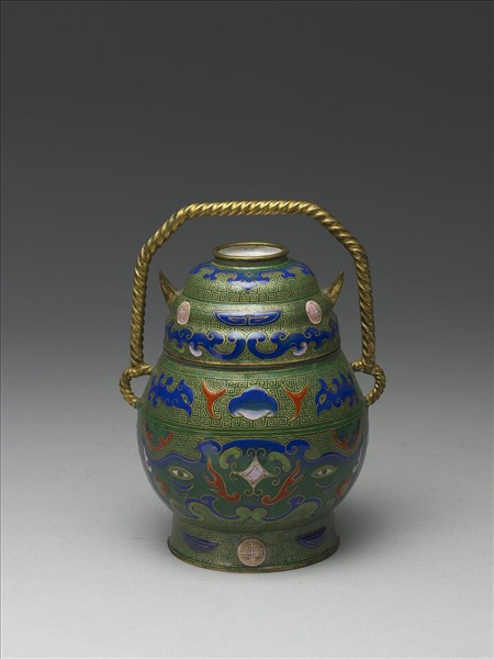 銅胎。斂口,圓肩,圓腹,外撇圈足,帶圈足鈕牛首形蓋,連耳繩索形提梁。全器以畫琺瑯技法裝飾,器內施淺藍釉,器表綠地,全器繪金色雲紋錦地,蓋頂圈足鈕外緣繪如意雲紋,蓋側中央繪獸面紋,下方繪一圈夔龍紋,肩部及腹部各繪二組獸面紋,圈足繪團壽字紋。底白地紅書「乾隆年製」雙方框雙行楷書款。與故琺41為一對。