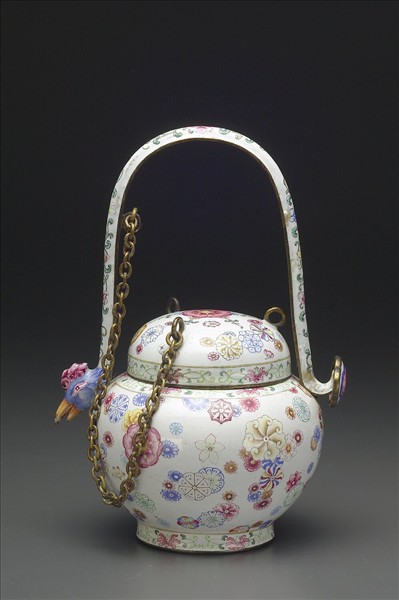 銅胎。斂口,圓腹,矮圈足,半圓形蓋上附三鍍金環鈕,其全器以畫琺瑯技法裝飾,一鈕上有鍊子與提梁相連,高提梁兩端分別成鳥首和如意雲頭式釘附在肩部。器內施淺藍釉,外表白地繪飾多彩皮球花,蓋緣、口緣及圈足飾有番蓮紋邊飾。器外底白地書藍色「乾隆年製」雙圓框雙行楷書款。
