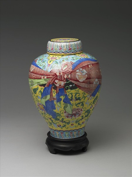銅胎。直口,短頸,圓肩,斂腹,帶圓冠式蓋。全器以畫琺瑯技法裝飾,器內施淺藍釉,器表黃地,蓋頂飾黃地雲頭紋及朵花,蓋側及腹部下緣繪靈芝紋。肩繪朵花,腹飾纏枝花卉,近肩處開光,內繪黃地番蓮紋,並加繪有紅面藍邊的包袱半掩著器腹,紅色部份繪龜甲錦對蝶、蝙蝠、桃實等,藍色部份繪卷草紋錦;包袱中背面呈淺綠色繪寶相花。外底淺綠地畫轉枝菊花,中間為藍色雙圓圈交疊,圈內白地書藍色「乾隆年製」兩行楷書款。附圓形木座一只。與故琺46為一對。