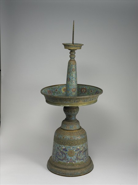 銅胎。全器共分六部分,由下至上為底座、大柱狀器、盤座、長圓錐管、小柱狀器及燭盤。全器以掐絲技法、琺瑯料填色為飾,淺藍色地,上半部飾纏枝花紋,盤座外壁飾以夔龍紋,底座有兩組雙龍拱壽圖,下方飾以仙山,並轉折或邊緣處鏨飾雲紋、夔龍紋及變形蓮瓣紋。
