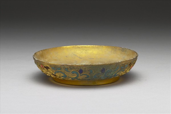 銅胎,內填琺瑯,侈口,淺弧壁,圈足,盤內與底露胎鍍金。外腹壁有細密連珠紋為地,其上鏨刻纏枝番蓮,花朵嵌寶石,枝葉填燒不透明藍釉。無款。