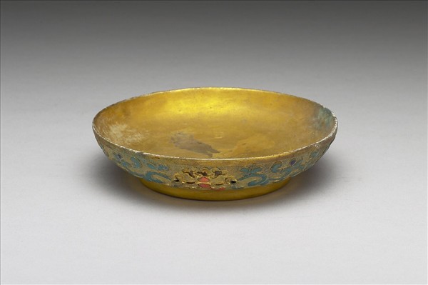 銅胎,內填琺瑯,侈口,淺弧壁,圈足,盤內與底露胎鍍金。外腹壁有細密連珠紋為地,其上鏨刻纏枝番蓮,花朵嵌寶石,枝葉填燒不透明藍釉。無款。