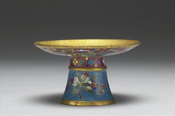 銅胎,掐絲琺瑯,高足盤,高圈足外撇。高足與淺盤外皆以紅釉、藍釉亞字為地,紅地上有四瓣朵花或雲紋間暗八仙,藍地上則飾佛手、桃實、蝙蝠、花卉等象徵長壽多福的吉祥圖案,盤外另題「萬、壽、無、疆」。足內施藍色釉,無款。