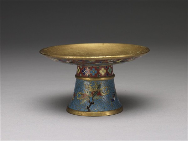 銅胎,掐絲琺瑯,高足盤,高圈足外撇。高足與淺盤外皆以紅釉、藍釉亞字為地,紅地上有四瓣朵花或雲紋間暗八仙,藍地上則飾佛手、桃實、蝙蝠、花卉等象徵長壽多福的吉祥圖案,盤外另題「萬、壽、無、疆」。足內施藍色釉,無款。