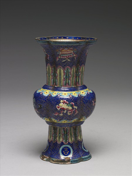 銅胎畫琺瑯,扁圓形瓶,全器皆作海棠形,撇口,長頸,碩腹,外撇高圈足。全器以寶藍釉亞字錦為地,腹與頸上繪蓮、寶瓶、盤長結、龍等雜寶,頸、足上對稱飾蕉葉紋及回紋,近足處篆書「吉、祥、如、意」。器內與底施淺藍釉。本件釉彩明度高,圖案多樣細膩,更顯吉祥富貴本意。