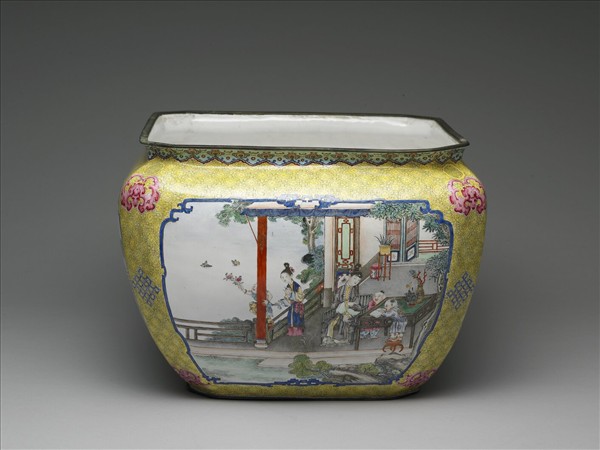 方形盆,敞口深壁,圈足。銅胎,外表以畫琺瑯為飾。器裡為白色素地;外壁彩繪;口緣為藍色垂雲紋,壁作黃地八方錦,綴飾蝙蝠與盤長紋。四面開光,繪仕女作息題材;一面繪女子坐桌邊教童子讀書,另二童子在旁嬉耍,並提燈、捧笙,旁植湖石牡丹。四個畫面的人物皆衣著工緻,穿戴華麗;居室也佈置齊整,陳設古雅,庭園植花石,而遠山秀美