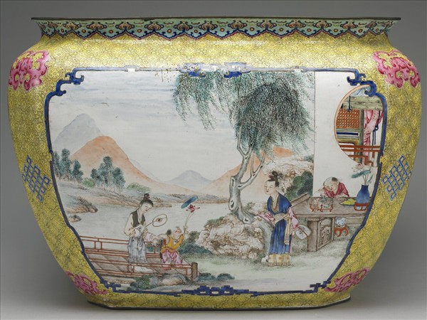 銅胎。方形盆,侈口,深腹,圈足。以畫琺瑯技法裝飾,器裡為白色素地﹔外壁彩繪;口緣為藍色如意雲紋,器身作黃地八方錦,綴飾蝙蝠與盤長紋。四面開光,繪仕女作息、童子嬉戲。人物皆衣著工緻,穿戴華麗;居室也佈置齊整,陳設古雅,庭園植花石,遠山秀美。器底部黃地繪五隻藍色蝙蝠。與故琺74成一對。