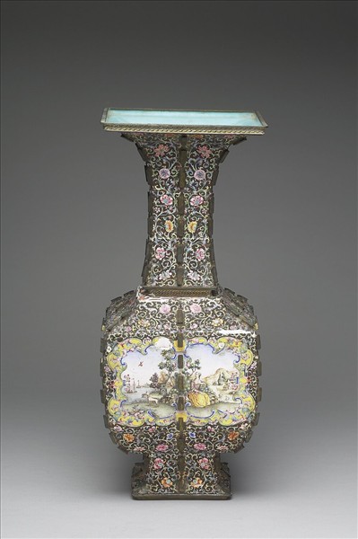 銅胎。侈口,長頸,斜肩,鼓腹,外撇高圈足,四邊及四面中央各有一鍍金出戟。以畫琺瑯技法裝飾,器內施淺藍釉,器表褐地,滿繪纏枝西洋式花卉錦地,四面腹部開光,內繪西洋人物、山水風景。外底白地藍書「大清乾隆年製」三行篆書款。與故琺77成一對。