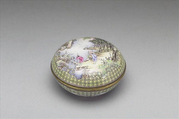 銅胎,扁圓盒,盒內施淺藍釉,蓋面周圍繪含八瓣花的龜甲紋為錦,中間開光內畫傳統山水人物;口沿飾與蓋面相同的錦地,下方繪薔薇牡丹和蘭花等紋飾,底白地書藍色「乾隆年製」雙方框雙行楷書字款。