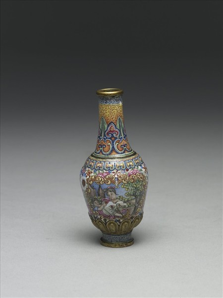 銅胎,圓口直頸,斜肩斂腹,圈足外撇。器頸飾蕉葉與如意雲頭紋,器腹飾白地花卉紋,並有二開光,開光中繪西洋人物母子圖。器腹下方鏨銅蓮瓣紋一圈。圈足內有「乾隆年製」楷款。附銅鏟一支,銅筷三根。