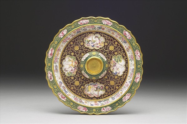 K金胎,內填與畫琺瑯。圓形淺盤,寬折邊,折沿作十二瓣菱花式,盤心凸起中並有圓形淺槽。折沿、盤面與凸座鏨刻纏枝花卉,填燒綠色或紫紅色釉,各有十二或四個小開光,繪西洋風景、人物或朵花,內外淺壁則飾花卉多樣。器底施湖藍色釉,中陰刻楷款「乾隆年製」,上承琺瑯小杯成組(故琺111)。