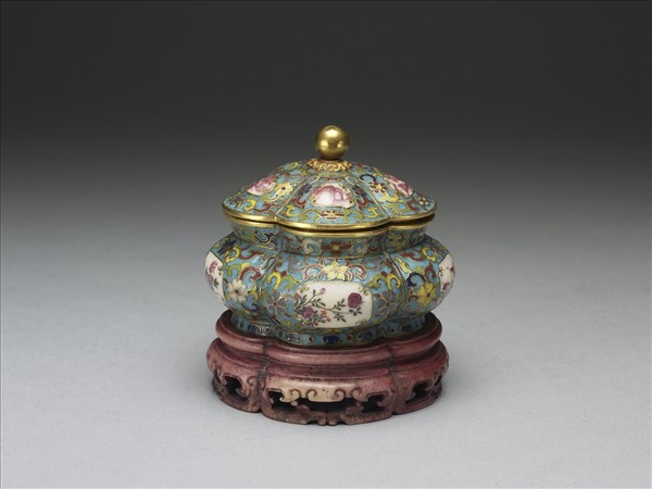 銅胎,蓋、頸、腹、圈足均呈五楞式。罐內施淺藍綠透明釉,器表藍地纏枝花間飾開光,蓋、腹各五,分別繪西方房舍、花卉圖。底白地書藍色「乾隆年製」雙方框宋體字款。附鏤雕染骨座。