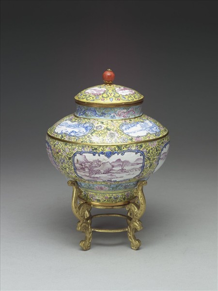 銅胎畫琺瑯珊瑚寶頂蓋罐,蓋、肩、腹各有四個開光,分別以卷葉、夔龍、蝙蝠為框飾,開光內為紫紅色與藍色之單色釉傳統山水,畫中有高塔、孔橋的湖光山色,與若干蘇州實景圖相似,可能從蘇州山水中擷取元素構成。全器黃地纏枝番蓮紋,頸有藍地彩繪夔龍,器腹底緣彩繪藍地鳳銜牡丹紋,底有「乾隆年製」雙方框宋體字藍款。並有鍍金卷葉紋座,整體造型獨特。單色琺瑯釉繪傳統山水,亦見於雍正時期,然與開光彩繪結合則屬乾隆畫琺瑯器之特色。