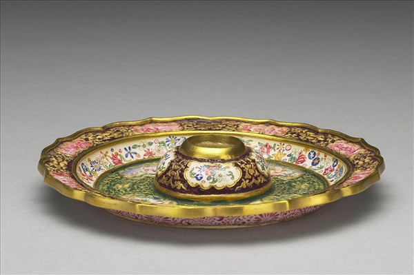 金胎,內填與畫琺瑯。圓形淺盤,寬折邊,折沿作八瓣菱花式,盤心凸起中並有圓形淺槽。折沿、盤面與凸座鏨刻纏枝番蓮紋,填燒紫紅色或綠色釉,各有八或四個小開光,繪西洋風景、人物或花卉,內外淺壁則飾花葉多樣。器底施湖藍色釉,中陰刻楷款「乾隆年製」,上承琺瑯小杯成組(故琺127)。金胎琺瑯器價昂稀有,唯皇帝方能使用。