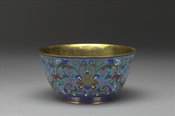 銅胎,掐絲琺瑯,器裡與底露胎處皆鎏金,鎏金略有銹蝕及剝落。侈口,弧形壁,圈足。器壁以藍色釉為地,以掐絲輪廓線作番蓮紋,填釉多彩,圈足處並飾雲紋與回紋,釉色濃厚,面有微小氣泡。一套十件,共收於手提木匣中。