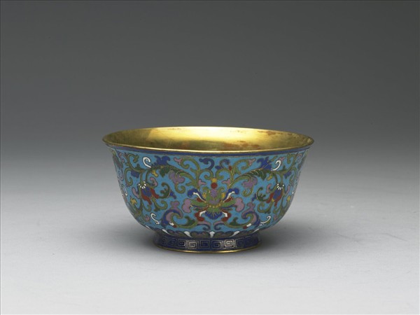 銅胎,掐絲琺瑯,器裡與底露胎處皆鎏金,鎏金略有褪落。侈口,弧形壁,圈足。器壁以藍色釉為地,以掐絲輪廓線作番蓮紋,填釉多彩,圈足處並飾雲紋與回紋,釉色濃厚,面有微小氣泡。一套十件,共收於手提木匣中。