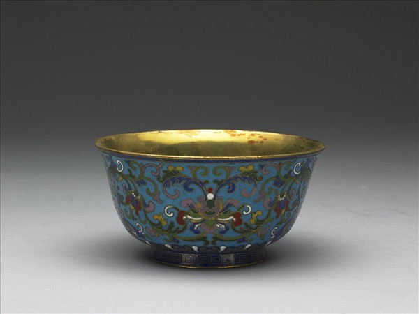 銅胎,掐絲琺瑯,器裡與底露胎處皆鎏金,鎏金略有褪落。侈口,弧形壁,圈足。器壁以藍色釉為地,以掐絲輪廓線作番蓮紋,填釉多彩,圈足處並飾雲紋與回紋,釉色濃厚,面有微小氣泡。一套十件,共收於手提木匣中。