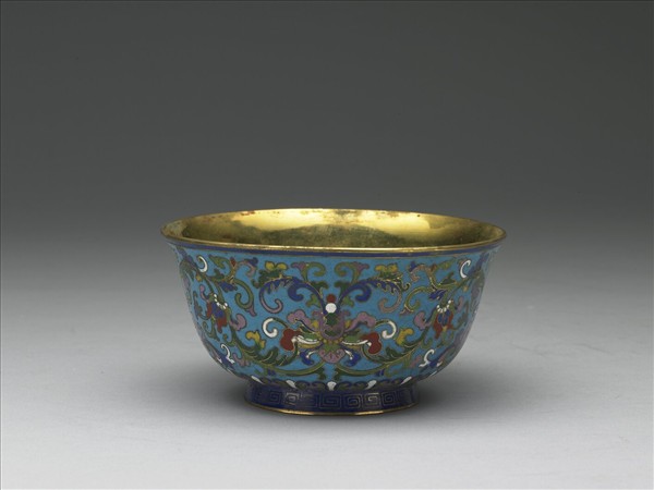 銅胎,掐絲琺瑯,器裡與底露胎處皆鎏金,鎏金略有褪落。侈口,弧形壁,圈足。器壁以藍色釉為地,以掐絲輪廓線作番蓮紋,填釉多彩,圈足處並飾雲紋與回紋,釉色濃厚,面有微小氣泡。一套十件(故琺150~159)收於手提木匣中。