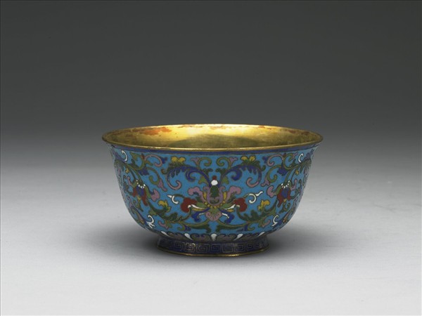 銅胎,掐絲琺瑯,器裡與底露胎處皆鎏金,鎏金略有褪落。侈口,弧形壁,圈足。器壁以藍色釉為地,以掐絲輪廓線作番蓮紋,填釉多彩,圈足處並飾雲紋與回紋,釉色濃厚,面有微小氣泡。一套十件,共收於手提木匣中。