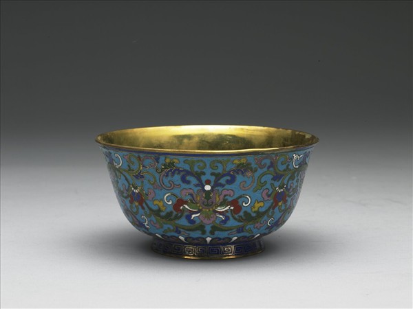 銅胎,掐絲琺瑯,器裡與底露胎處皆鎏金,鎏金略有褪落。侈口,弧形壁,圈足。器壁以藍色釉為地,以掐絲輪廓線作番蓮紋,填釉多彩,圈足處並飾雲紋與回紋,釉色濃厚,面有微小氣泡。一套十件,共收於手提木匣中。