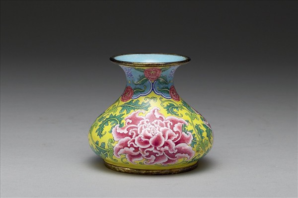 銅胎畫琺瑯。石榴式小瓶,敞口,削肩,夸腹,大圈足。器內施湖藍釉,外表黃地,頸飾雲頭紋與圖案花葉,腹繪紅、藍、紫三色牡丹。底有白地藍書「乾隆年製」雙方框楷款。此器係仿康熙朝之作品。本件一式成對(與故琺161),共儲於有題款「乾隆年製銅胎洋琺瑯石榴式瓶一對」木盒中。