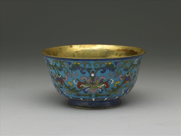 銅胎,掐絲琺瑯,器裡與底露胎處皆鎏金,鎏金略有褪落。侈口,弧形壁,圈足。器壁以藍色釉為地,以掐絲輪廓線作番蓮紋,填釉多彩,圈足處並飾變形蓮瓣紋與回紋,釉色濃厚,面有微小氣泡。一套十件,共收於手提木匣中。