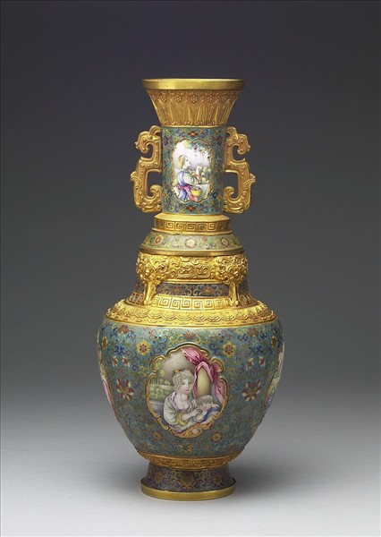 金胎,侈口、頸呈多階式,豐肩,斂腹,撇圈足,魚龍雙耳。口沿下鏨小花及蕉葉紋;頸上段呈筒狀,掐絲琺瑯纏枝花錦,前後嵌畫琺瑯開光內繪畫西洋仕女;下層依次鐫繡球錦和回紋、掐絲纏枝花、鏨蟠龍及獸面各四、 纏枝花等四層;腹部掐絲琺瑯藍地纏枝花錦,四面開光處繪不同西洋母子圖,腹下方鏨一圈蓮瓣,圈足飾纏枝花。口緣有「大清乾隆年製」楷款。