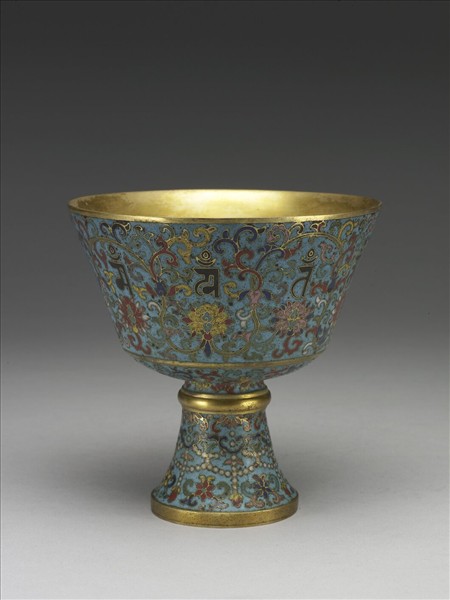 銅胎掐絲琺瑯杯,撇口,杯壁深斂,高足外撇,凸節把。器壁藍地番蓮紋,並有梵文一圈,皆居於纏枝花葉繞圍之中。足外壁亦為藍地掐絲花卉紋,並飾如意雲頭瓔珞紋。足內有雙方框「乾隆年製」楷款。此杯兩件一組,同儲於一木匣。