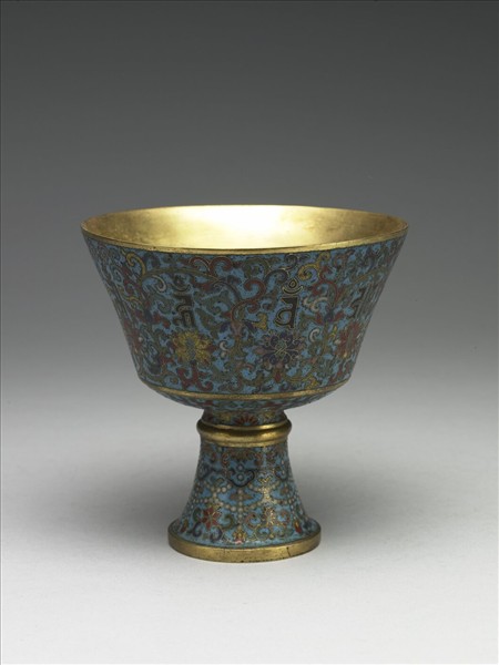 銅胎掐絲琺瑯杯,撇口,杯壁深斂,高足外撇,凸節把。器壁藍地番蓮紋,並有梵文一圈,皆居於纏枝花葉繞圍之中。足外壁亦為藍地掐絲花卉紋,並飾如意雲頭瓔珞紋。足內有雙方框「乾隆年製」楷款。此杯兩件一組,同儲於一木匣。