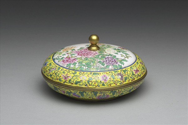 銅胎,蓋與器身同形對合成圓盒,器內施淺藍釉,器外壁則以黃地繪纏枝番蓮花葉為飾,器蓋繪白地牡丹為飾,牡丹盛開,花葉繁茂。底有淺藍地「乾隆年製」藍字雙方框楷款。