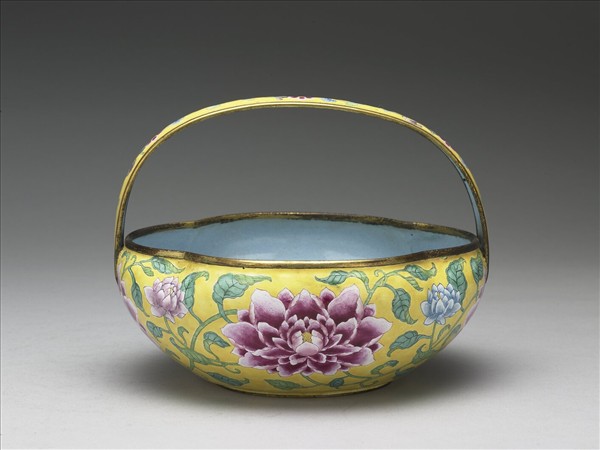 銅胎,帶提梁四瓣花口花籃。器內與提梁內側皆施淺藍釉,器外壁則先上一層白色底釉,再描繪各色紋樣及黃地,主體紋飾牡丹花葉紋,牡丹大朵盛放,花葉崢嶸生長。器底有雙方框「乾隆年製」紅字楷款。