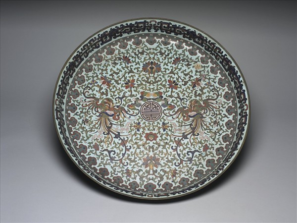 掐絲琺瑯,銅胎。侈口微撇,淺壁,圈足。盤內外施湖藍色釉地,盤心以雲紋一圈為界,內滿飾轉枝番蓮花,中心以五色祥雲拱出團「壽」字,左右並飾鳳凰一對,內壁有拐子龍一周,外壁為卷葉紋與蝙蝠。器底露胎,無款,但有多磨痕。