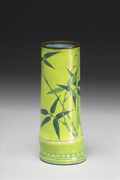 銅胎畫琺瑯,口緣與圈足露胎,足部釉層些微剝落。仿竹節小瓶,直口,深腹向下略闊,平底。器身施黃至綠色釉,有深淺交互變化,展現植物自然色澤,上繪含葉竹枝一段。器裡施淺藍色釉,底黃地繪盛靈芝花瓶,瓶上紅書「雍正年製」楷款。