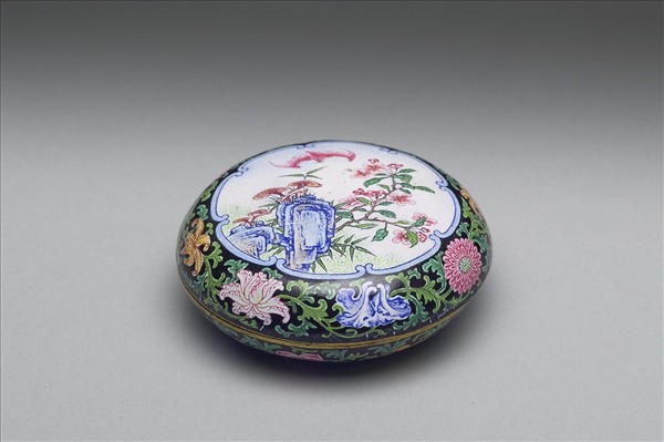 銅胎,子母蓋扁圓盒。盒內施藍釉,蓋頂部開光內白地繪日日櫻、靈芝、竹、蝙蝠及石等,蓋面開光外圍和盒身為黑地飾各種轉枝花。盒底黃地由藍色雲紋圍成六瓣花形框,內白地書紅色「雍正年製」雙行楷書款。