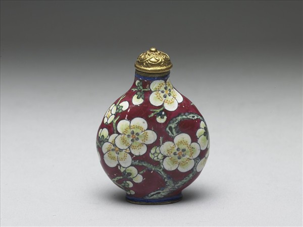 銅胎畫琺瑯。扁圓形小瓶,平口,短頸,碩腹,淺圈足。全器施紅釉為地,滿繪連枝梅花,色彩飽和鮮明,口緣與圈足加繪藍釉一道。足內白地藍書「雍正年製」款。帶鎏金蓋與牙匙。