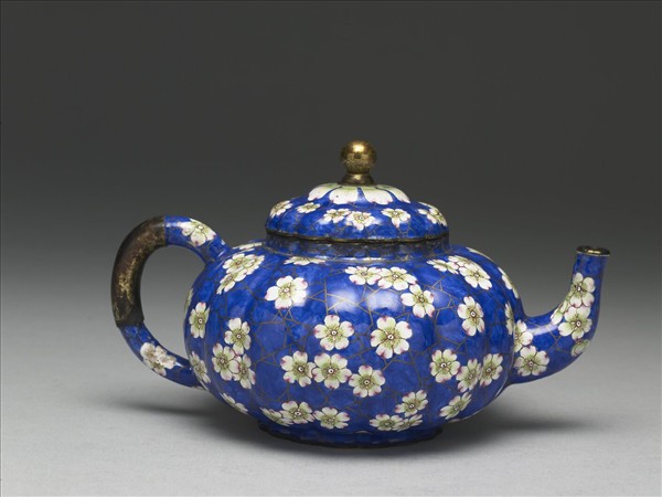 銅胎,畫琺瑯把壺,十六楞式的壺蓋、腹、及圈足。把露銅胎,器內施湖藍釉,器壁滿飾藍地冰梅紋,蓋上除藍地冰梅紋外,近銅鈕處上有蓮瓣紋一圈。足底白地雙圈「乾隆年製」楷款。