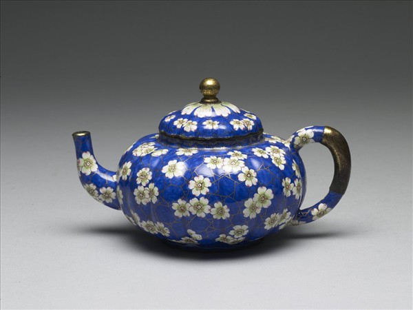 銅胎,畫琺瑯把壺,十六楞式的壺蓋、腹、及圈足。把露銅胎,器內施湖藍釉,器壁滿飾藍地冰梅紋,蓋上除藍地冰梅紋外,近銅鈕處上有蓮瓣紋一圈。足底白地雙圈「乾隆年製」楷款。