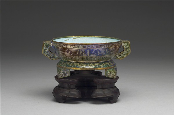 銅胎,敞口,雙耳,深壁,三足。器內施淺藍釉,器表塗繪藍、綠、紫紅色為地釉,以金彩加飾,腹部及雙耳繪有回紋,下方繪有兩個雙身獸面紋,下接三支矢形足,上以金彩繪回紋。底白地紅書「乾隆年製」雙方框楷款。附一只三足如意雲形木座。