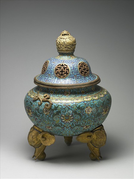 銅胎。小短頸,鼓肩,斂腹,帶鍍金雲紋獅形鈕蓋、三象首足以掐絲技法、琺瑯料填色裝飾。器表淺藍地,蓋鈕下方及頸部有一圈番蓮紋邊飾,蓋沿為回紋錦地,有六個鍍金萬壽紋圓形窗,肩部為一圈如意雲紋,腹部為纏枝番蓮紋,器底中央為一朵番蓮花。