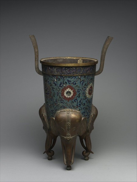 銅胎,掐絲琺瑯。三足爐,侈口,深弧腹,雙朝冠耳,圓底,下接三象首足。器腹與雙耳施藍釉為底,上滿飾轉枝番蓮紋,器口加飾夔龍一圈。口緣露胎處陰刻「大清康熙年製」款。銅胎略有銅銹,釉層有剝落,器身鎏金多磨損,器內露胎。