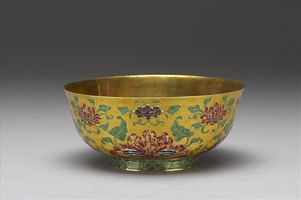 K金胎,內填琺瑯,敞口,弧壁,深腹,圈足,碗內露胎。外腹施透明黃釉為地,可見器壁所鐫之細密弦紋,又鏨刻大小番蓮紋,填燒多色釉,圈足以透明綠釉裝飾橄欖形紋樣。器外底白地藍書「乾隆年製」雙方框楷款,加雙方框。
