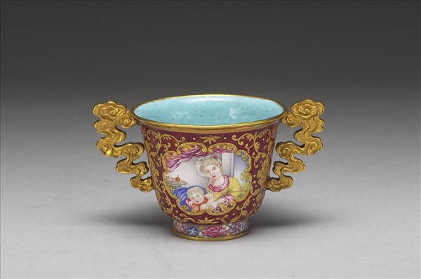 K金胎,侈口斂腹圈足杯,附鏤空雲紋耳。杯內施淺藍釉,身鏨鐫浮雕式西洋花草紋,填燒棗紅色琺瑯釉(上面再罩燒一層透明釉)為錦地,腹前後開光,繪西洋母子圖,圈足繪各種朵花,底施淺藍釉,書藍色「乾隆年製」雙方框雙行楷書款。