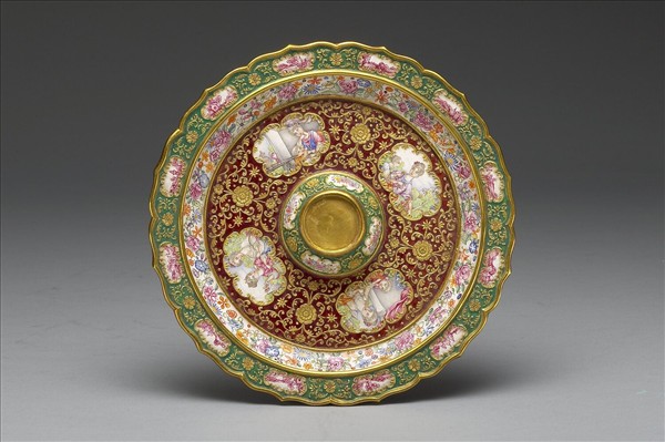 K金胎,十二片蓮瓣式的折沿平底盤,盤心呈覆碗式突起處為杯座。盤沿、杯座和盤心鏨刻浮雕式西洋花草,填燒綠和棗紅色琺瑯釉(上面再罩燒一層透明釉)為錦地,開光處畫不同的西洋式景致、花卉和母子圖,盤內壁繪百花錦,外壁繪轉枝卷草紋及轉枝花葉紋各一圈,底施淺藍釉,中央內凹處陰刻「乾隆年製」無框雙行宋體字款。