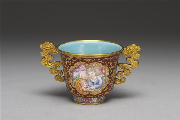 K金胎,侈口圈足杯, 二側飾靈芝雲紋執耳。器身模鑄、鏨刻卷草紋, 再以內填琺瑯技法填綠色、紅色等玻璃釉。杯腹開光,彩繪西方仕女或母子圖。結合內填、畫琺瑯技法與西方風格,底部有「乾隆年製」款。