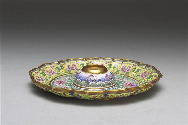 K金胎。圓形淺盤,作十二瓣菱花式口,盤心凸起中置圓形淺槽。以畫琺瑯技法裝飾,器內外以黃釉灑棕色小點或淺紫色釉為地,繪飾纏枝番蓮花,盤心凸起處作海濤與紅蝠。器外底施淺藍色釉,中藍書楷款「乾隆年製」,上承琺瑯小杯成組(故琺263)。