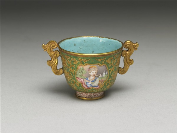 圓口,深直壁下斂,鍍金雲耳,有圈足。全器以內填琺瑯及畫琺瑯兩種技法裝飾,器內施淺藍色釉。器身飾綠地鏨金卷草花葉紋,上並有白地畫琺瑯開光二,開光內各繪西洋女子一名。圈足飾白地紅色卷草紋,外底有淺藍地雙方框「乾隆年製」藍色楷款。與故琺274成組。