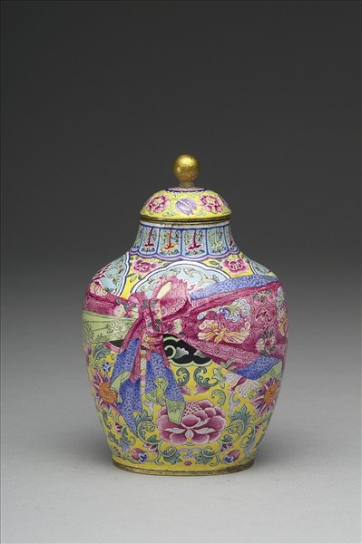 銅胎畫琺瑯。扁圓形罐,直口,豐肩,碩腹下斂,帶球鈕圓蓋。器身以黃釉為底,繪各式複枝花卉,肩部疊繪包袱巾,作半掩包裹狀。底書「乾隆年製」白地紅色楷款。本件大小形制完全仿自雍正朝作品,但技術、釉色則各有勝擅。儲於書有「乾隆年製銅胎廣琺瑯包袱罐一件」題款之木匣中。
