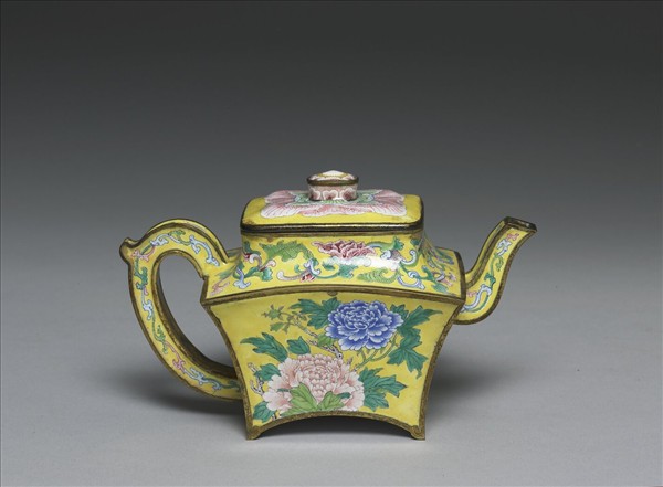 銅胎。呈方形,由四個倒梯形焊合成壺身。器內施淺藍釉,器表黃地,長方蓋鈕繪成牡丹花心,蓋面鏨成凸起的牡丹花瓣施粉紅釉。肩飾轉枝牡丹,壺腹四面飾各色折枝牡丹兩朵。底成瓦狀內凹,白地書紅色「乾隆年製」雙方框楷書款。此器係仿康熙朝牡丹方壺之作品。本件一式成對(與故琺305),共儲於有「乾隆年製銅胎洋琺瑯滷壺一對」題款木盒中。