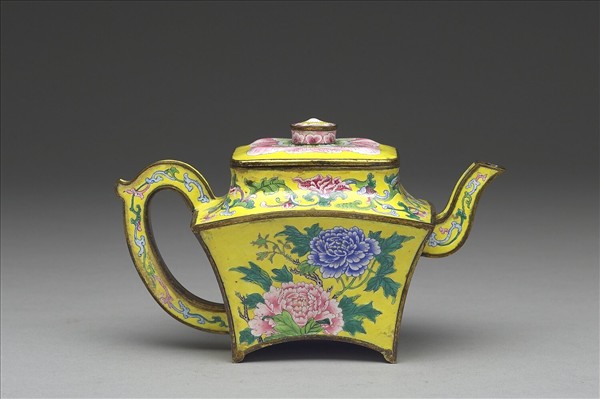 銅胎。呈方形,由四個倒梯形焊合成壺身。器內施淺藍釉,器表黃地,長方蓋鈕繪成牡丹花心,蓋面鏨成凸起的牡丹花瓣施粉紅釉。肩飾轉枝牡丹,壺腹四面飾各色折枝牡丹兩朵。底成瓦狀內凹,白地書紅色「乾隆年製」雙方框楷書款。此器係仿康熙朝牡丹方壺之作品。本件一式成對(與故琺304),共儲於有「乾隆年製銅胎洋琺瑯滷壺一對」題款木盒中。